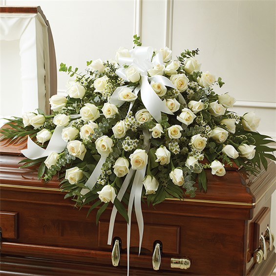 •Half casket cover arrangement of white roses, monte casino and fresh greenery; accented with a white satin ribbon